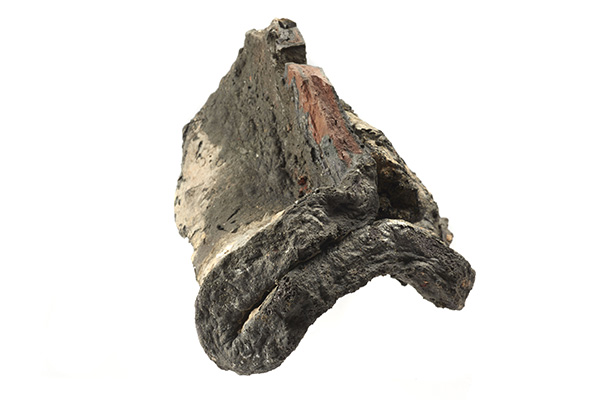 Blackened and warped ceramic roof tile which should be flat and terracotta in colour has been bent in half by temperatures over 1500oC.