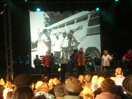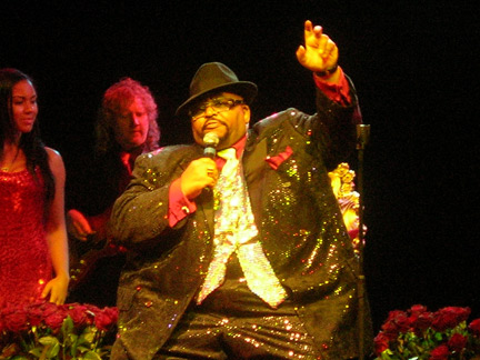 Having spoken to a fellow next to me in the crowd who’d recently seen Burke in concert at the Barbican, I was informed that despite his massive girth, Burke would ‘materialise’ on stage, presumably though the miracle of electricity or lack thereof after he’d been wheeled to his throne. On this occasion, however, Burke’s smoke screen was formed by a gaggle of smoothly quaffed young ladies in glittering red sheaths who parted like the proverbial Moses led Sea to reveal their seated celebrity master. And masterful Burke was too for the various styles he sang in, as well as for his way with the crowd, facetiously thanking them for their ‘love lights’ when cigarette lighters and mobile phones were held aloft during his performance. His generosity was later evidenced when he requested that his backup singers (one, his youngest daughter, of 21 children, the other a granddaughter, of an incredible 90) throw beads or t-shirts to whomever he selected, imploring one blue faced fellow from the Czech Republic, whom he’d invited onstage to dance, to distribute the long-stemmed red roses behind him to the ‘ladies in the crowd.’ Burkes’ singing, which was richly warm and soulful, also included numbers written for him by musicians such as Tom Waits - ‘Always Keep A Dime in Your Mind’ and Eric Clapton - ‘Why Can’t I Feel What I Want to Feel?’ Burke also spoke of some of his musical comrades, departed and living, among them Ike Turner, Ben E. King and his former boyhood school-mate Otis Redding, as well as James Brown, the latter of whom Burke’s larger than life attitude and actions put us in mind of. A subsequent medley of covers included: ‘Proud Mary’, ‘Stand by Me’ and Sittin’ on the Dock of the Bay’ which the audience sang along with. Adoring fans clambered onto the stage during the show, not always at Burke’s invitation and the group, which almost seemed to comprise a cross section of human nature given their mini-dramas, danced their hearts out, though a good time was, seemingly had by all. For my money, Burke’s a great character, and performers of his ilk are something of a live history lesson in and of themselves; both facets of his persona were wisely and amply drawn upon by him during the course of his performance, which, with the aid of his rockin’ r and b band, with its nine piece horn section and bluesy guitar, bass, drums and super soulful keyboard kept the crowd groovin’ and, movin.’