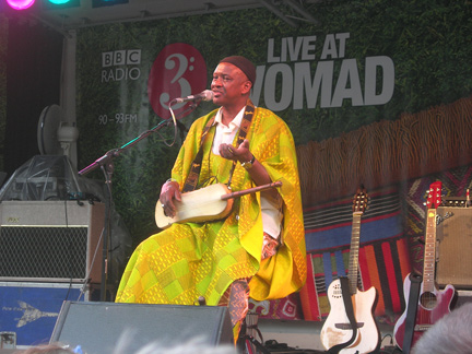 A stroll over to the BBC 3 Stage, situated in a lovely little dell surrounded by trees, and we found ourselves just where we should be, in front of the marvellously mellow Malick Pathe Sow and his uniquely soul-stirring band. Pathe Sow, a former side man of Senegal’s Baaba Mal, is now, decidedly, in a class by himself. The music of his group, which includes guitar, hoddu lute, kora and nianiooru violin has an easy sense of timelessness about it which is very compelling. During the course of Pathe Sow’s set the sky turned from sunny to stormy but no one left despite the fact that as we were dancing, we were also getting soaked, for the compelling music seemed to dismiss any and all clouds, outer or, inner with its wafting beauty. As he and his inestimable band were returning to the stage for their second encore in response to our cheers, the sky opened up in earnest, and we headed hurriedly towards the Big Red Tent for the performance of the aforementioned Hypnotic Brass Ensemble.