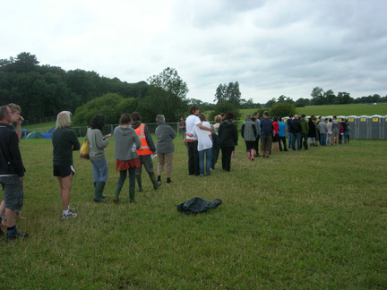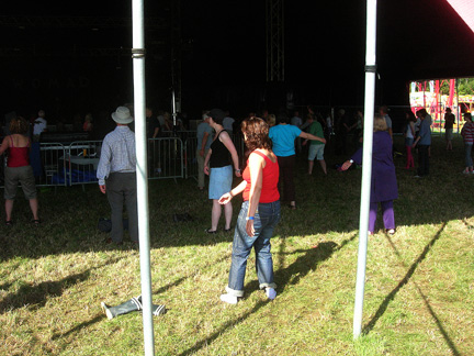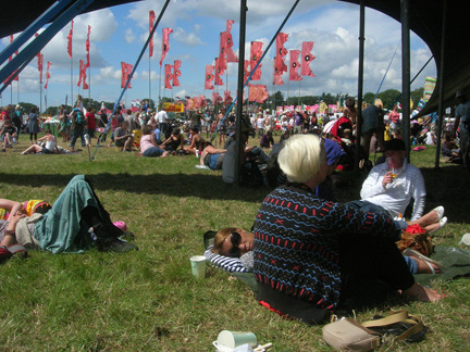After a night of tossing and turning against the audible crossfire of two backstage bars, we got a later start the next morning than hoped for, though we still managed to find our way to the 9:30 Tai Chi class in the Big Red Tent we’d danced the week’s angst away in the night before. While we were there, standing feet apart, trying to slowly shift our vibes back into neutral, who should drive by but a group of motley milkmen tooting their Harpo Marx horns rhythmically in time with the clinking of the partly filled ‘milk’ bottles lining the sides of their pared down cart. Their rumbling toots really brightened up what was until that moment, for the most part, a guilt ridden, belly hiding group of middle aged festival goers who’d only just admitted to themselves that they were out of shape. This sobering Saturday offering was followed by a quick walk through the grounds in search of breakfast, during which time we managed to consume the bulk of the snacks we’d brought with us to the festival and yours truly walked out of one sit in food stall when a tiny, plastic looking piece of pizza I wouldn’t serve to a Barbie doll was plunked down before me to the tune of three quid!