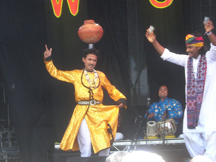 This smile inducing chance subsequently lead us onto the exotic sounding Dhoad Gypsies of Rajasthan from the region’s wild Thar Desert area, on the Open Air Stage nearby where their manic, frantically executed drumming, singing, dancing, balancing and fire-eating, was greeted with wildly enthusiastic applause by the sunny Saturday afternoon crowd. By the time their veiled dancer in her colourful costume was whirling to their tablas, harmoniums and mouth harps, most of the Gypsies’ audience was whirling too.